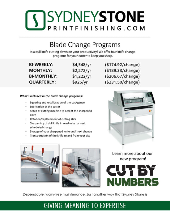 Our service facility is also a busy hub for rebuilding finishing equipment. Sydney Stone understands that buying pre-owned equipment provides your business with a more affordable option and we currently maintain one of the largest inventories of reconditioned small format finishing equipment in Canada. We are proud of our onsite rebuild center, which allows us to properly assess, clean and fully recondition the equipment back to its factory tolerances. Our technicians are factory-trained and spend the time to ensure that you receive a machine that is ready for the rigors of current on-demand production requirements.