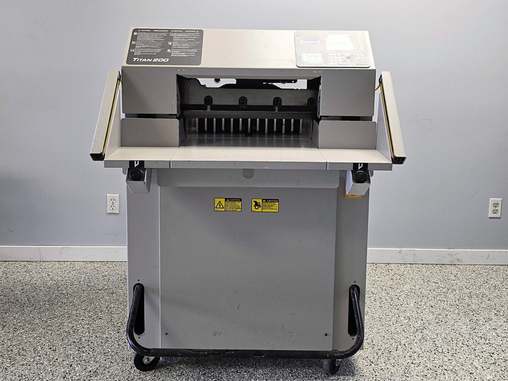 Reconditioned Challenge Titan 200 Hydraulic Paper Cutter with light beams. This 20” wide hydraulic paper cutter is fully programmable and features a light beam safety barrier. Includes 2 knives, tools, and manuals.